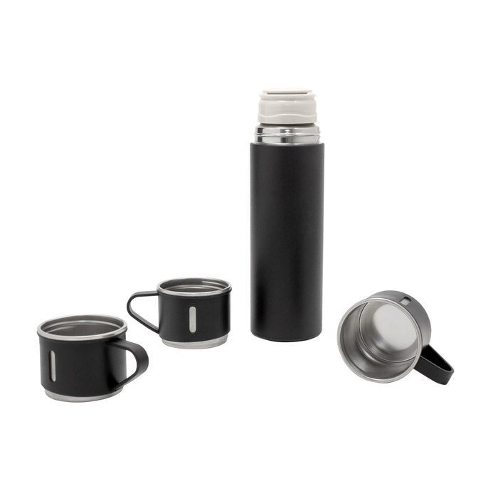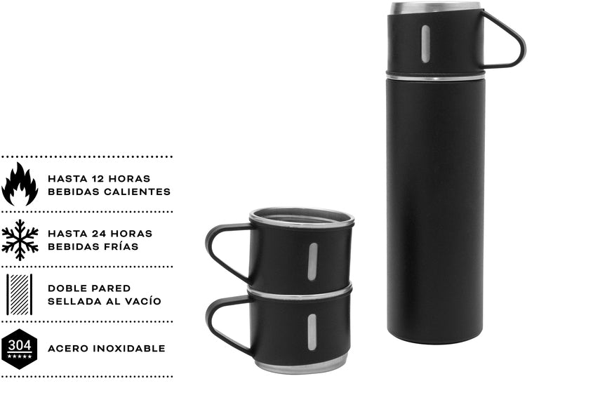 Ø 6,5 cm x 23,5 cm. Acero inoxidable y Polipropileno. Capacidad 500 ml. Set de termo y tres tazas. Termo con doble pared sellado al vacío. Tecnología Vacuum. Acero inoxidable 304 interior / 201 exterior. Tapa y tazas Ø 6,5 cm x 5 cm. Capacidad 120 ml. Acero inoxidable 304 interior / Polipropileno exterior. Pintura acabado mate. Mantiene por más de 12 hs la temperatura de las bebidas calientes y 24 hs de las bebidas frías. Presentación en caja de regalo Kraft.