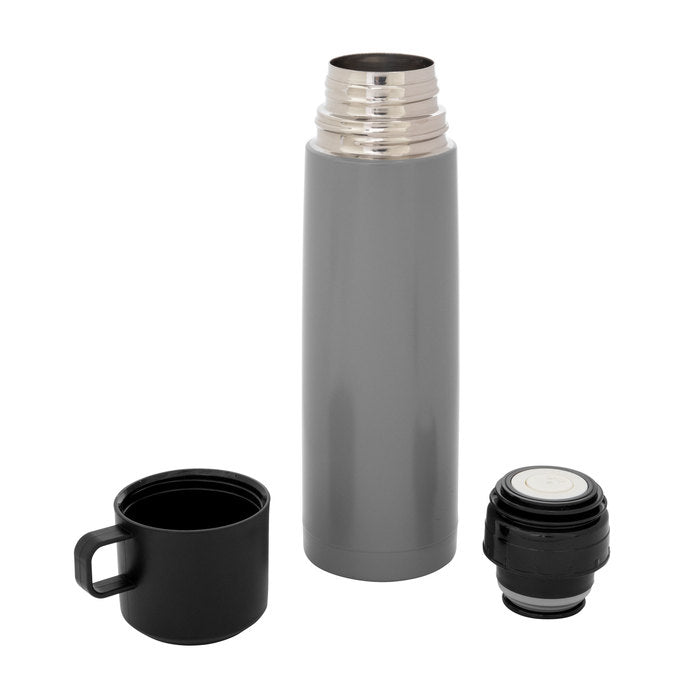 Termo con doble pared sellado al vacío. Tecnología vacuum. Acero inoxidable 304 interior / 201 exterior. Tapa y taza plásticas en color negro. Pintura acabado mate. Mantiene hasta 6 hs la temperatura de las bebidas calientes y hasta 10 hs la de las bebidas frías.